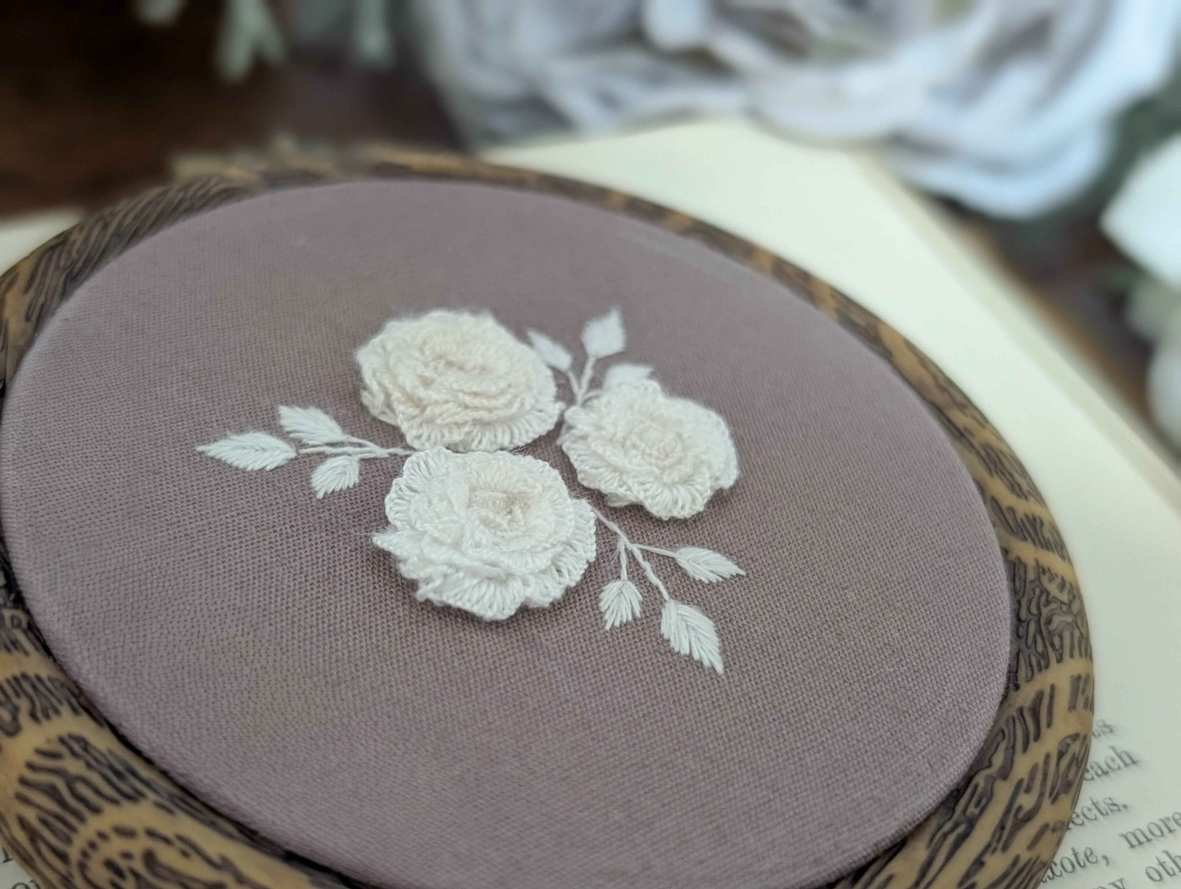 立体刺繍の技法により、まるで本物のバラが咲いているかのような繊細で美しい仕上がり。