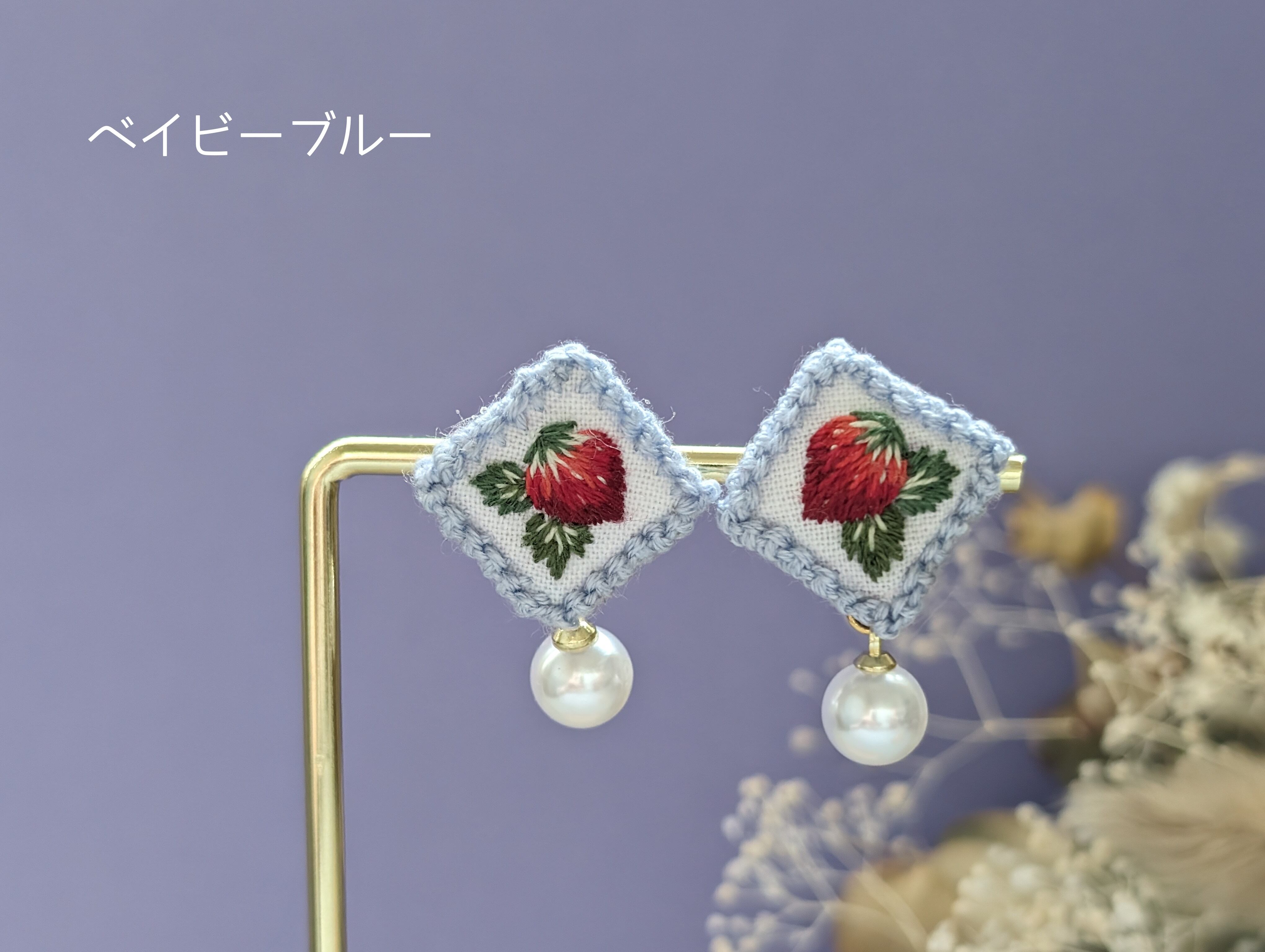 いちごは刺繍糸を6色使いとてもリアルになっていて、見るたびに春の訪れを想像させてくれるアイテムです。