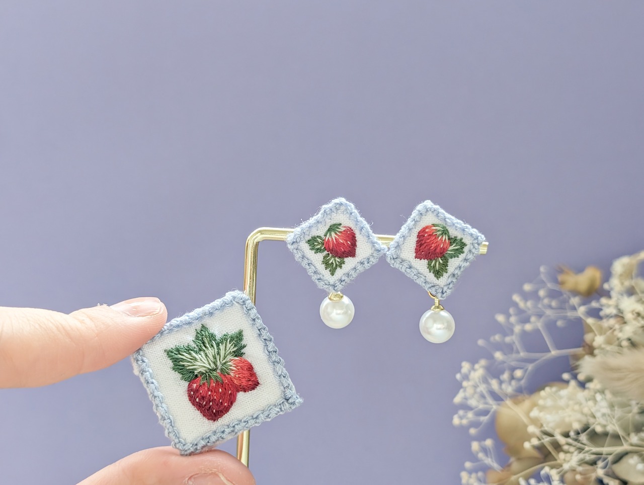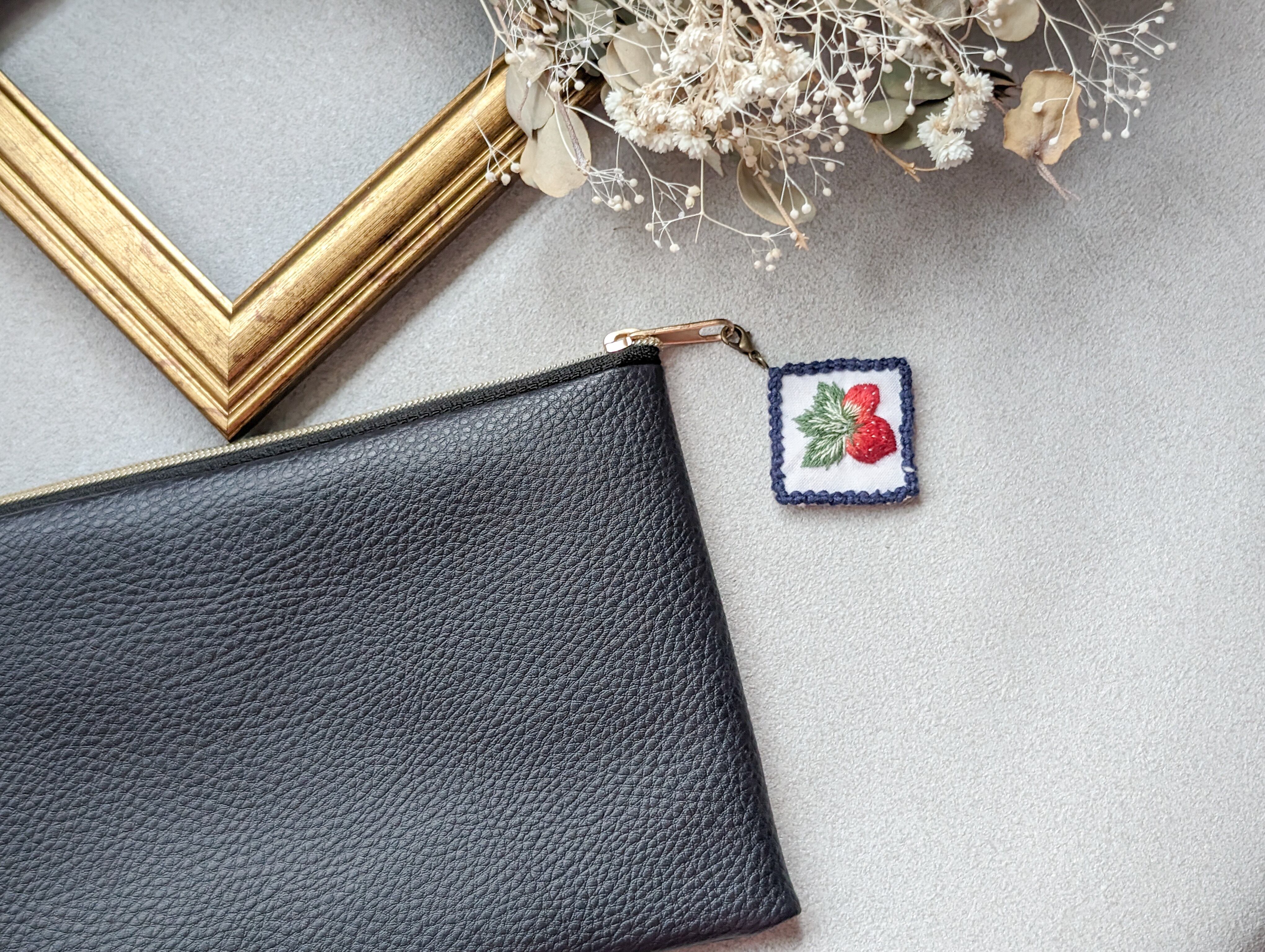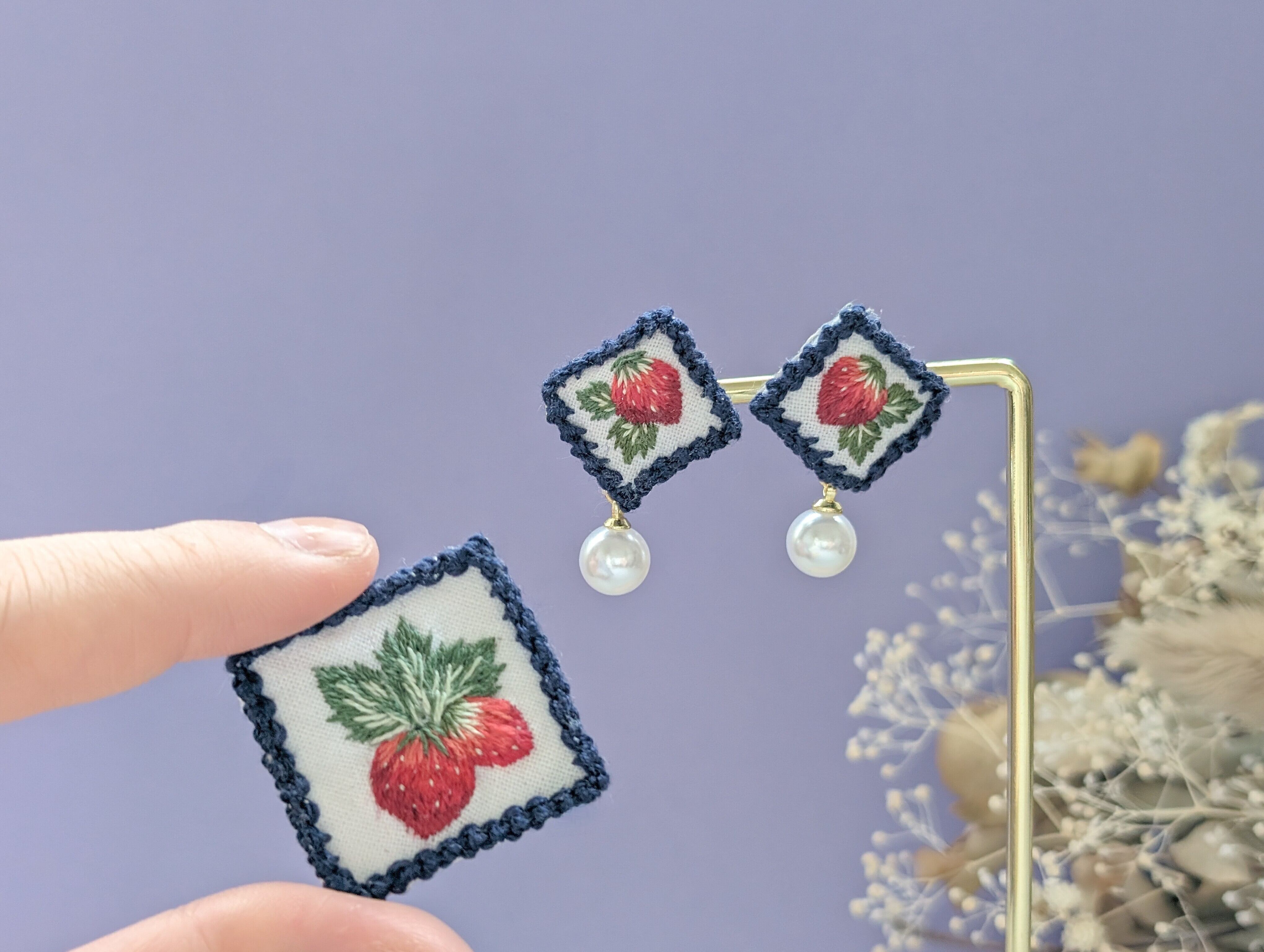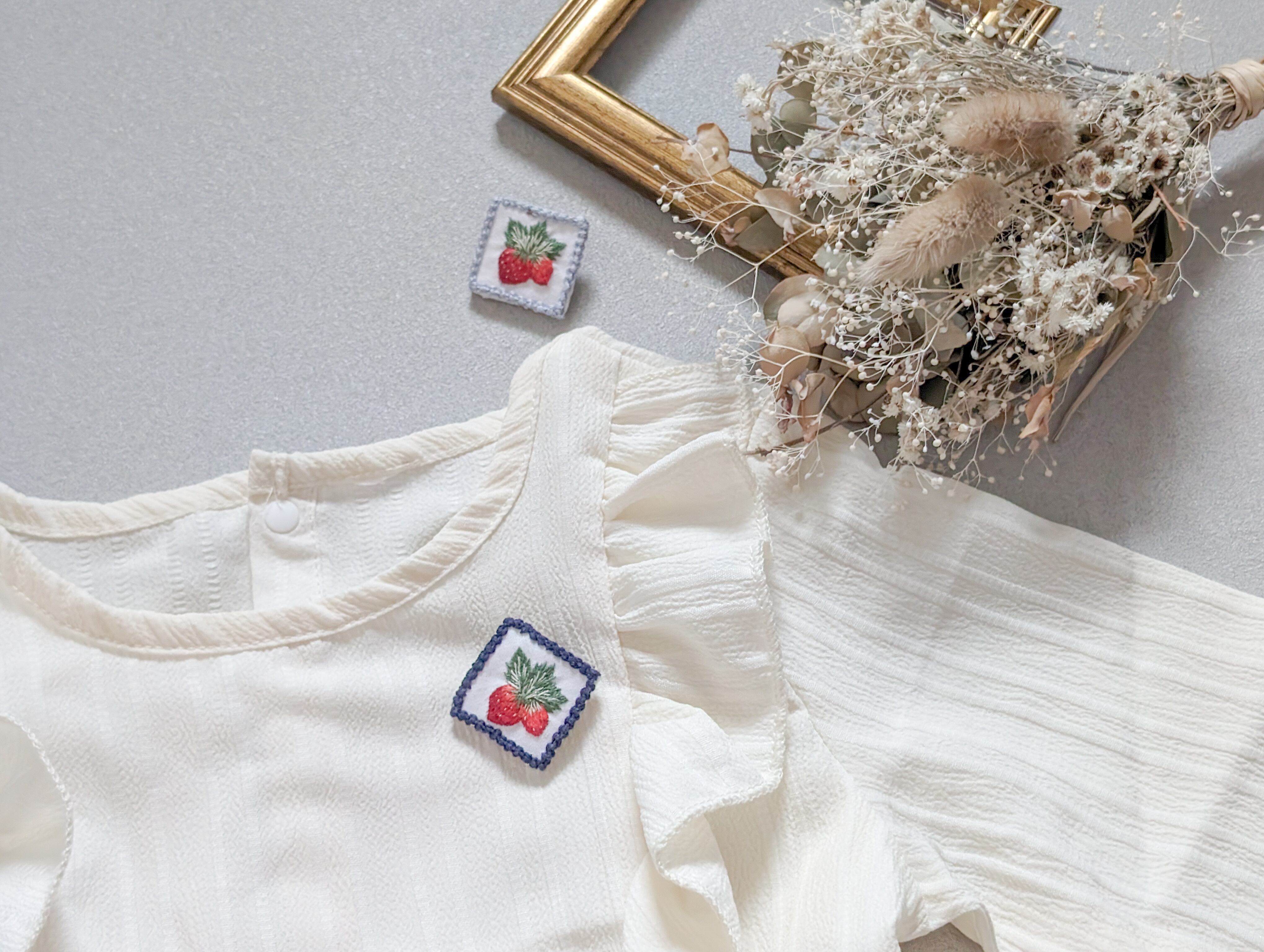 いちごは刺繍糸を6色使いとてもリアルになっていて、見るたびに春の訪れを想像させてくれるアイテムです。
