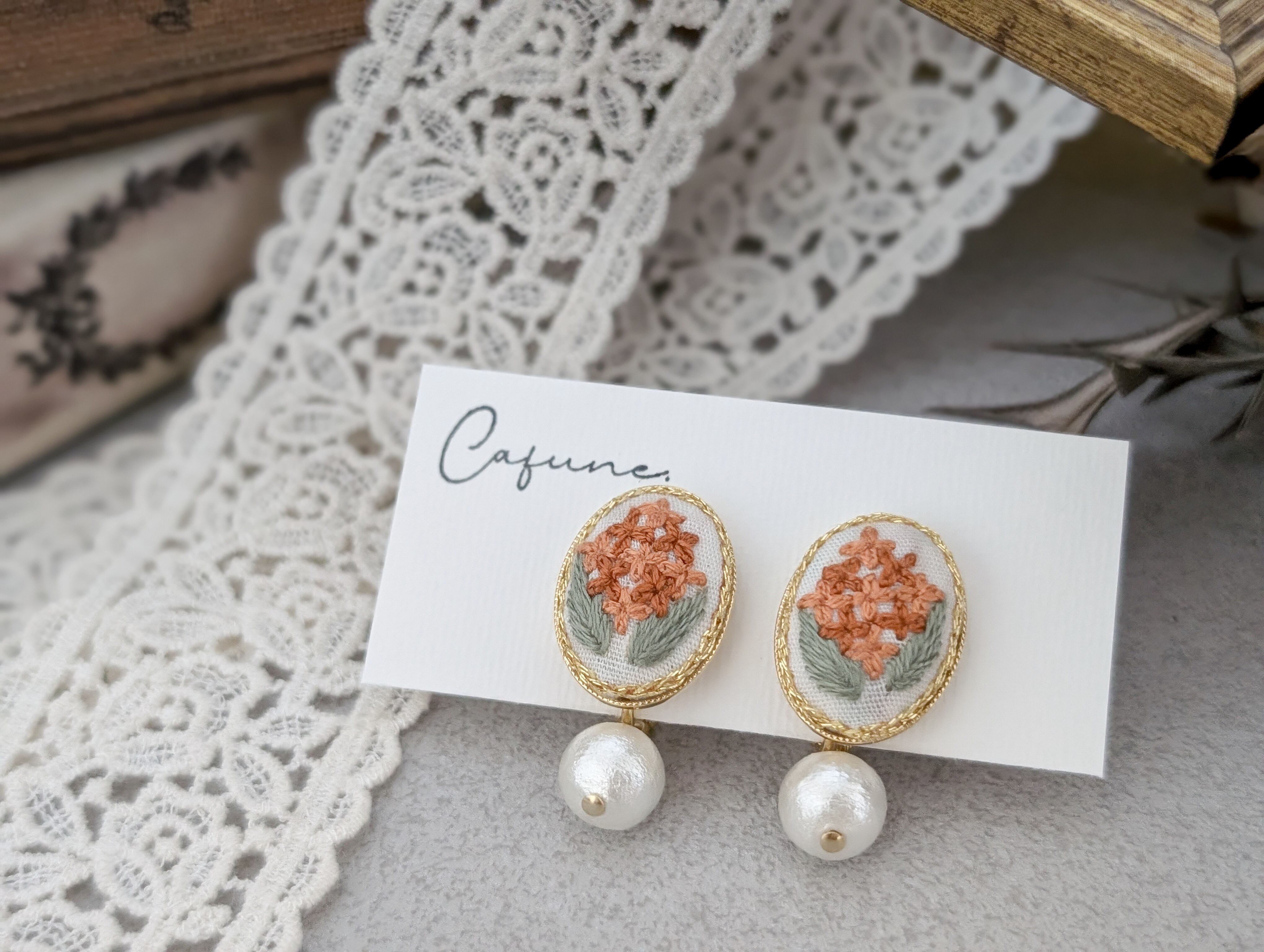 金木犀の耳飾りは、秋の訪れを感じさせるアクセサリーとなっています。生成生地に施された2色のオレンジで表現された金木犀の刺繍は、まるでリアルな花々が耳元に咲いているかのよう。さらに、縁をゴールドの刺繍糸で囲むことで、カメオのような上品さを演出しました。