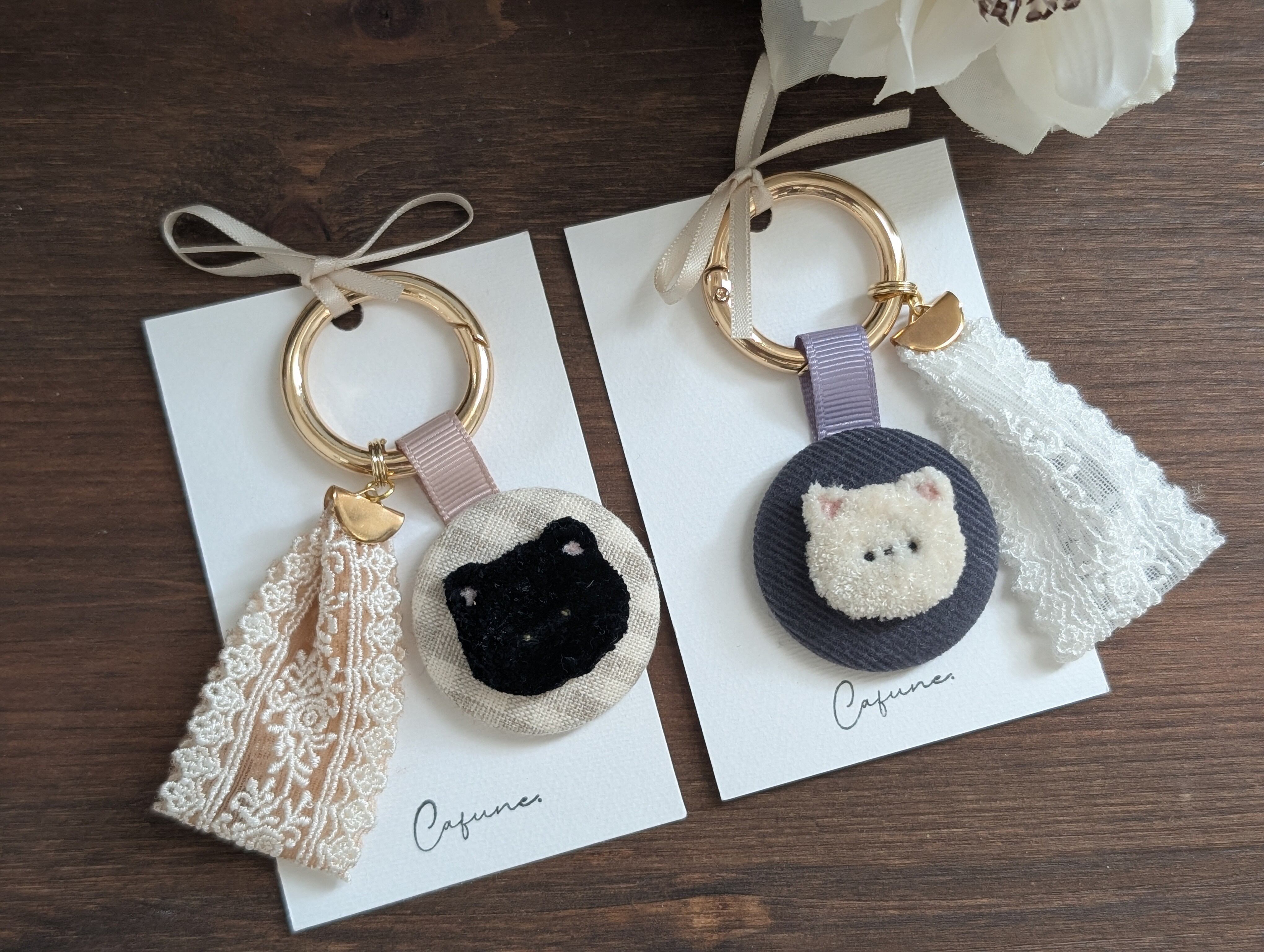 キーホルダー、ブローチ、ポニーフック、ヘアゴムと、さまざまな形に仕立てられるので、日常にそっと猫の愛らしさをプラスできます。猫好きな方へのギフトにもぴったりです。
